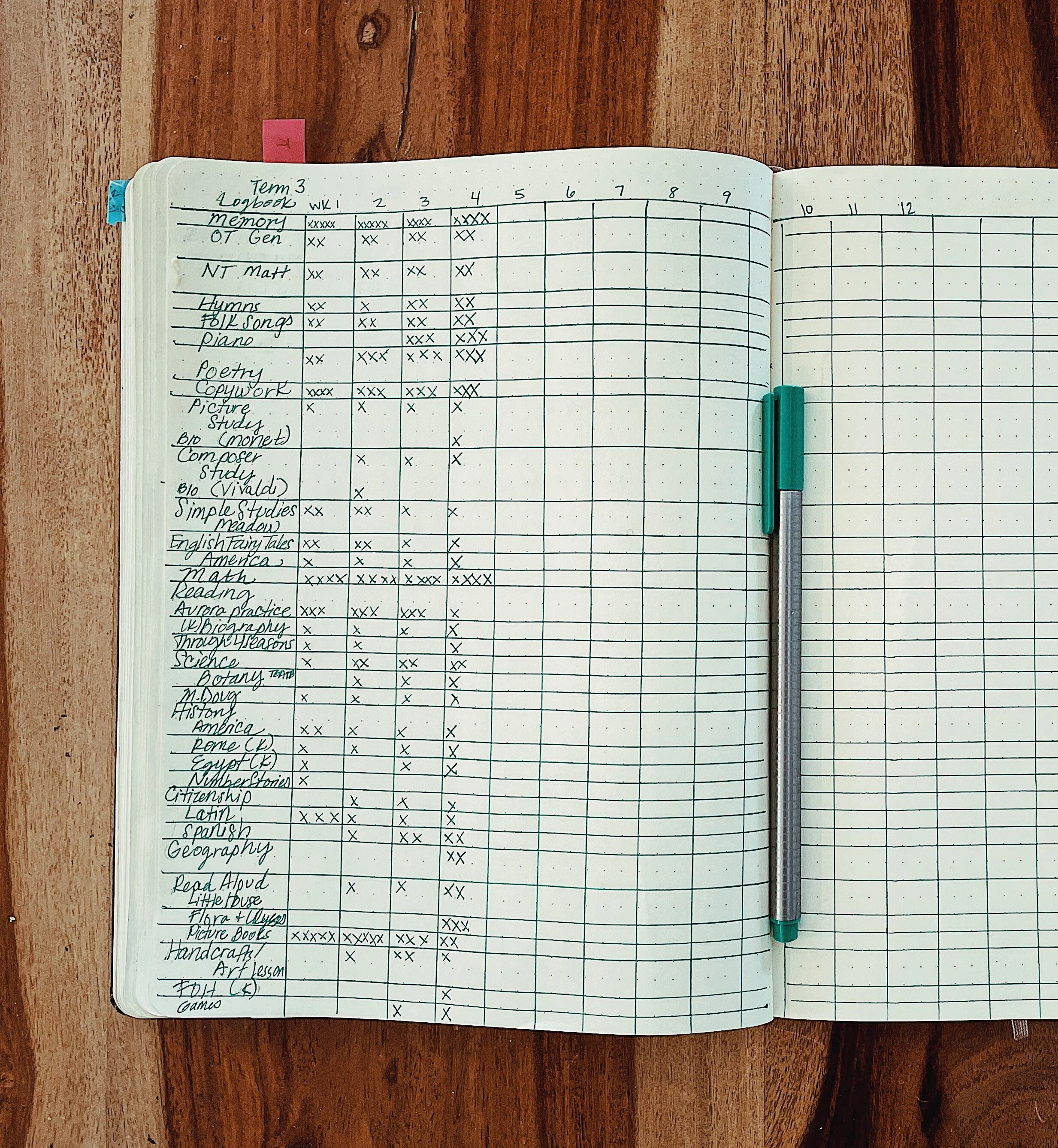 What I donât keep in my logbook are all the extra-curricular and physical things we do â so our weekly hikes, sports practices/games, outdoor play, get-togethers with friendsâŠetc. are not recorded here but they are in my daily notes.